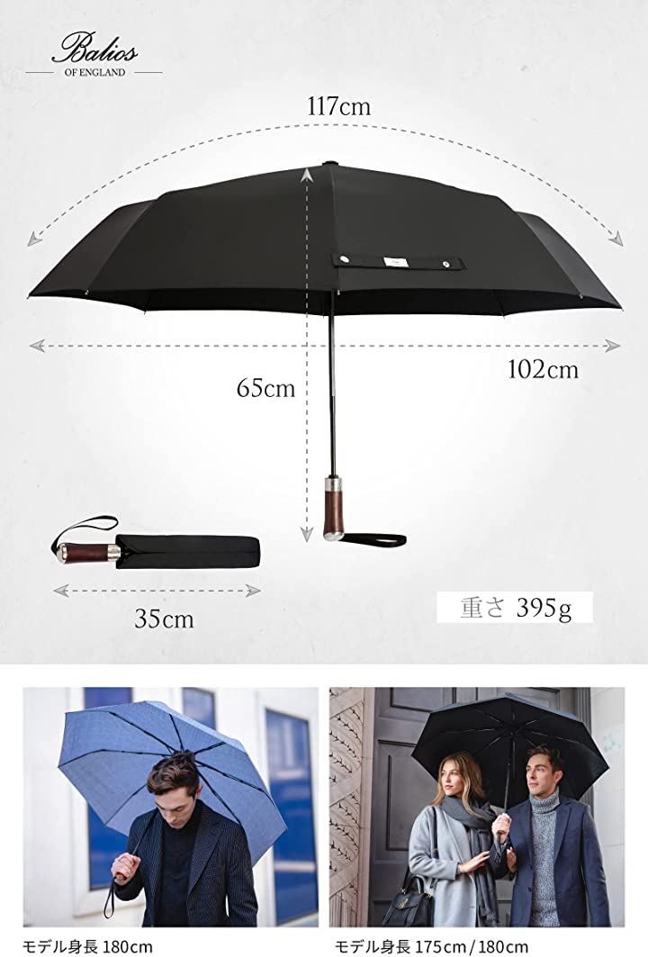 Balios 英国 バリオス 折りたたみ傘 メンズ 65 cm 8本骨 395 g 自動開閉 晴雨兼用 ジャンプ傘 ワンタッチ 大きい ジェットブラック