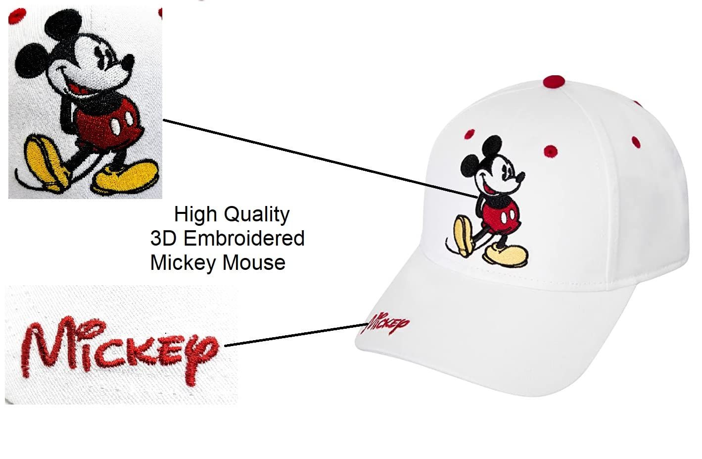 whiteにマルーンの縁取り、つばにアップリケの刺繍、ひさしにはミッキーのサイン、後ろにはフック/ループの調整。大人用フリーサイズ。手洗い。輸入品