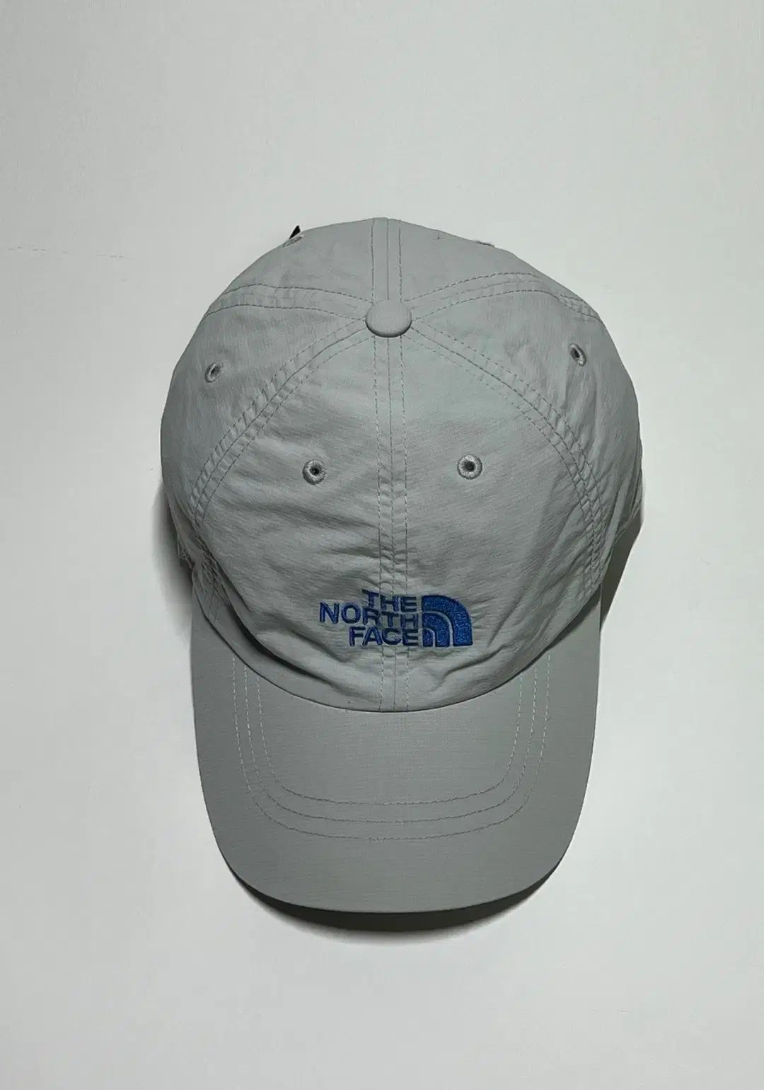 これはザ・ノース・フェイスのナイロングレー/ブルーのボールキャップです。