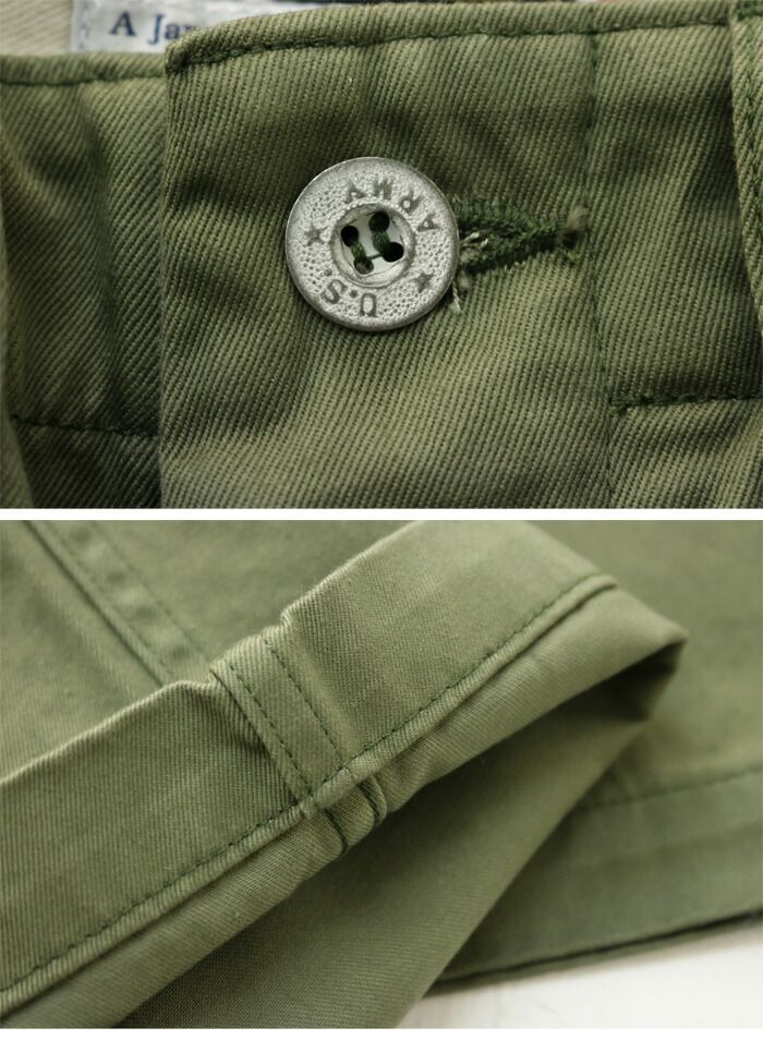 フロントのボタンフライ仕様やサイドの2本針縫製、両玉縁のコインポケットやバックポケットなど、M-41チノの特徴的なディテールが施されています。