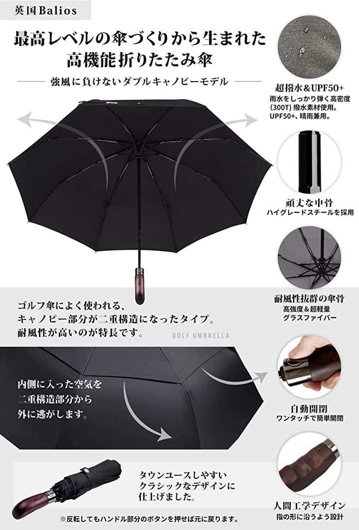 Balios 英国 バリオス 折りたたみ傘 メンズ 耐風 65 cm 8本骨 395 g 自動開閉 晴雨兼用 ジャンプ傘 ワンタッチ 大きい メタルグレー centimeters