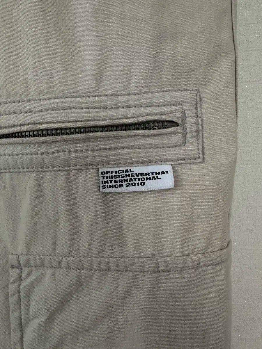 ディスイズネバーザット フライト カーゴ パンツです。カーゴ ポケット デザインテープが目立つデザインです。ポケットが多く実用的です。
