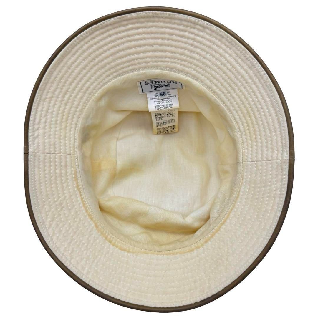HERMES エルメス セリエボタン バケットハット 麻 カンガルーレザー アイボリー×ブラウン 56 フランス製 メンズ レディース